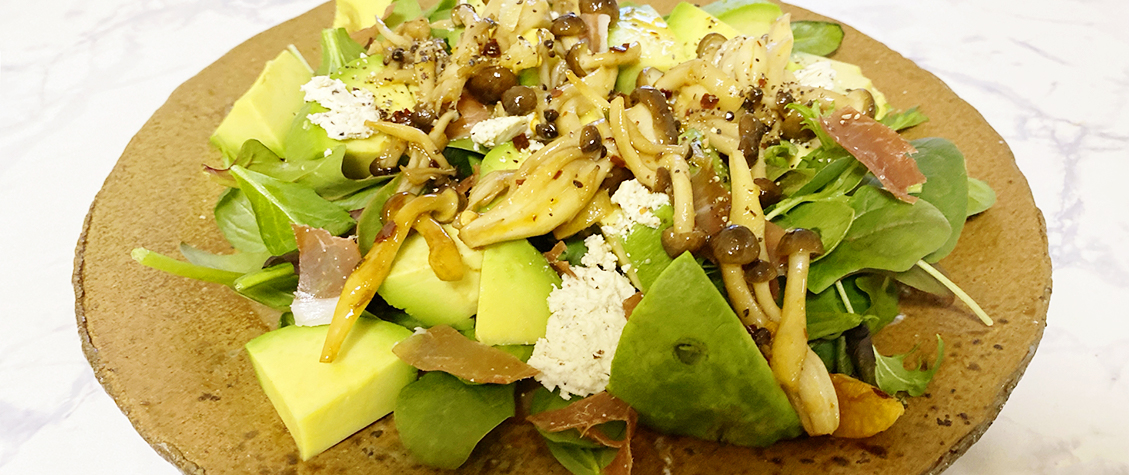 濃厚なアボカドにヘルシーなリーフときのこを合わせたサラダです。特製のまろやかソースが好相性で箸が止まらなくなります。