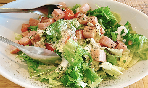 カリカリベーコンとシャキッとしたレタスにクリーミーなドレッシングをたっぷりかけました。チーズの舌触りが風味をより引き立てます。